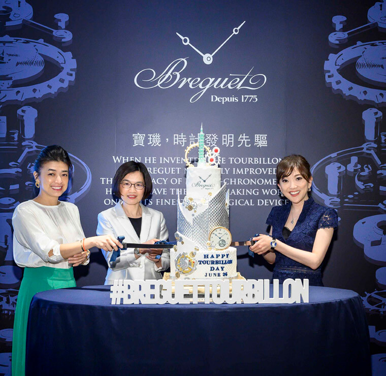 ▲(左起)Swatch Group台湾总经理Heidi、台北101购物中心营运长朱丽文,以及宝璣副总经理Maggie,共同为2019年陀飞轮日切蛋糕庆祝。