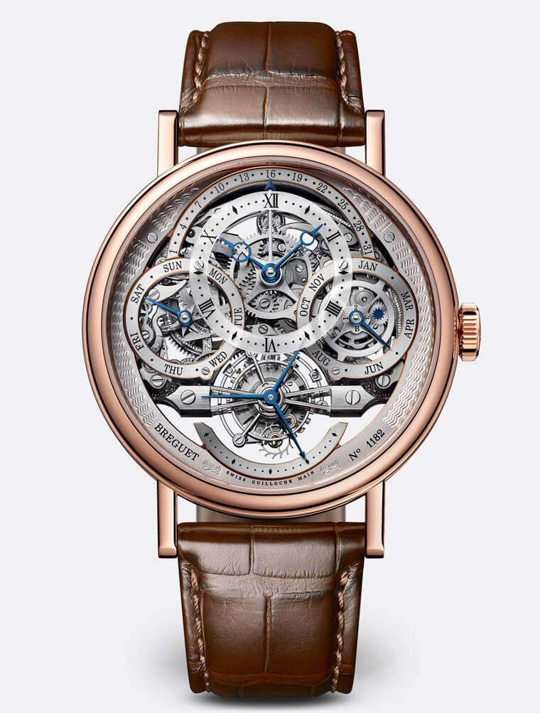 18K玫瑰金材质/558QP3手动上链机芯/偏心时、偏心分、小秒、逆跳日期、星期、月份、闰年显示/陀飞轮装置/万年历功能/蓝宝石水晶镜面、透明底盖/防水30米/表径41mm/参考价:NT$ 7,761,000