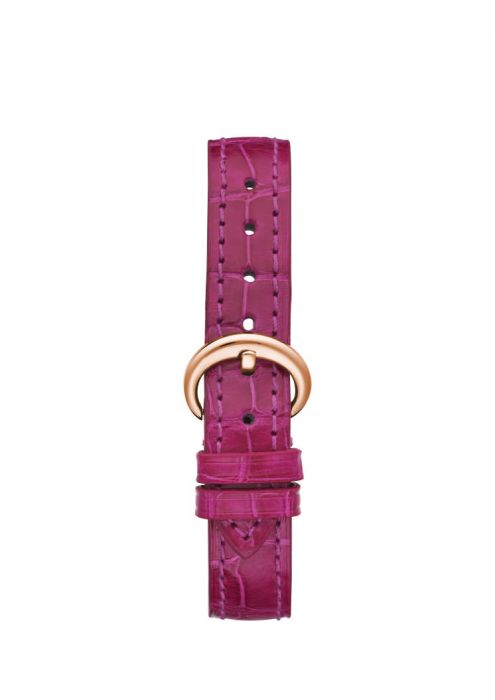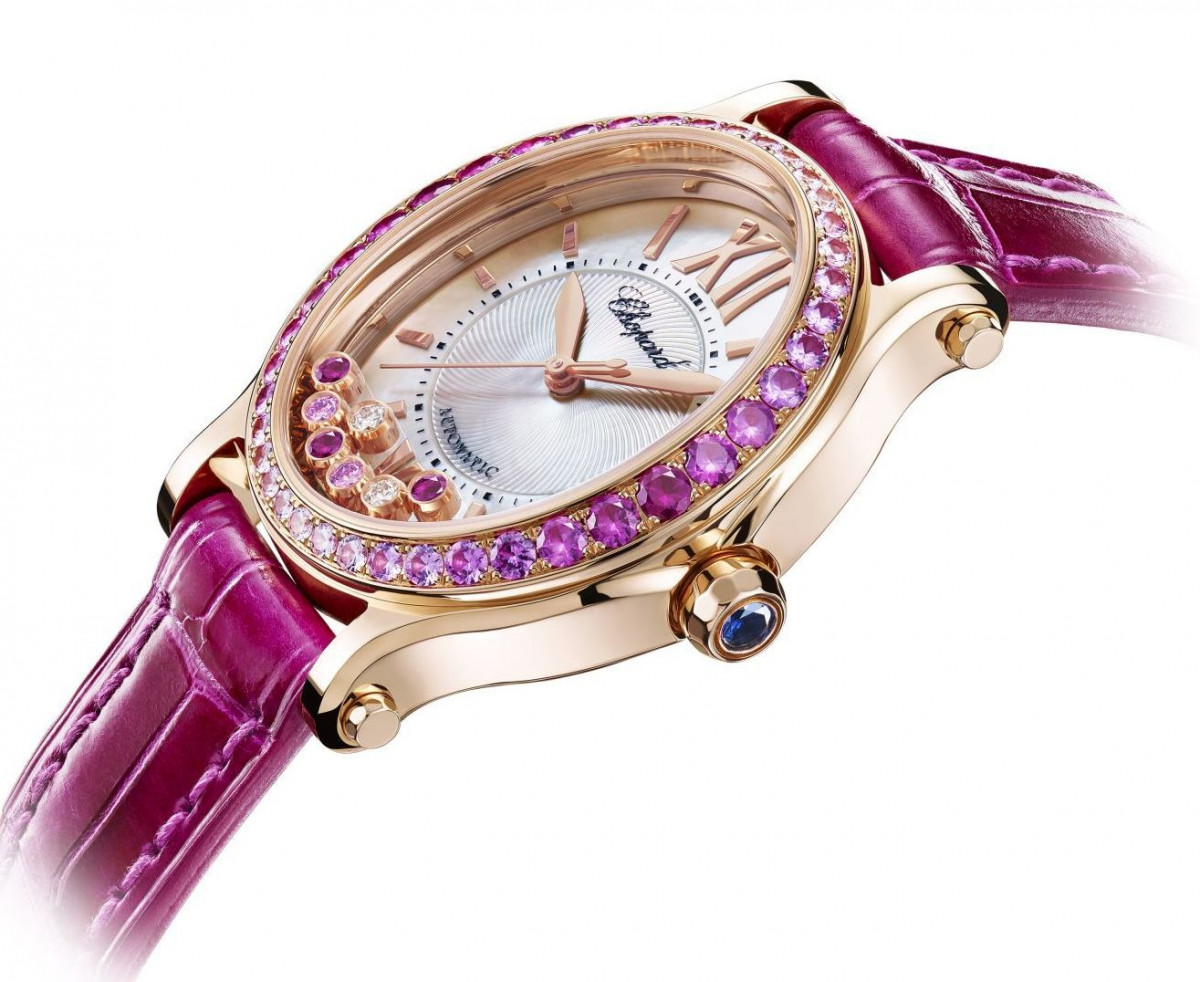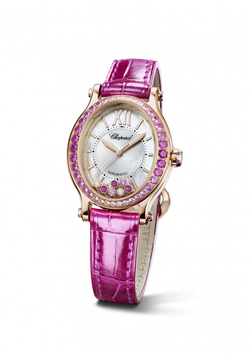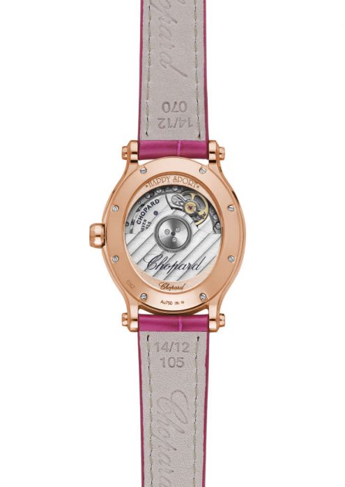 ▲腕表以粉红表带呼应表圈及面盘上的粉红宝石。透过透明底盖可以一探机芯之美。
