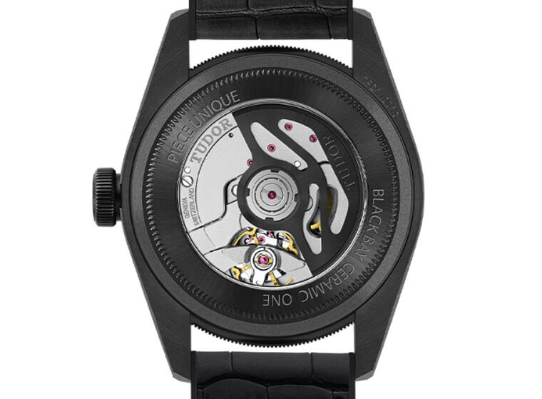 ▲身为特制款式,表款也难得换上了透明底盖露出帝舵自制机芯,而且包括底盖周围的不锈钢材质和机芯自动盘也都一律以PVD技术镀上一层黑色,呼应整体的黑色调。