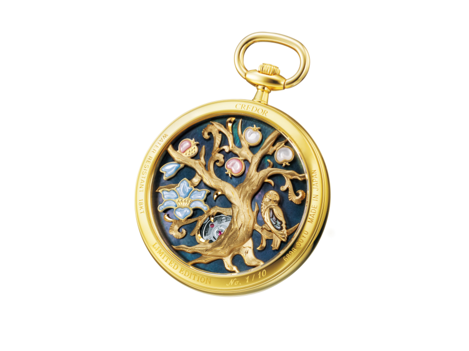 此款怀表搭载了贵朵引以为傲的超薄机械机芯,而翻过表背则是现代名工照井清旷日费时、竭尽心力制作的立体金雕。表背雕金的设计概念是「生命之树」,以象徵了时间洪流的大树为中心,将栖息在其上的各种生命透过3个主题加以呈现。