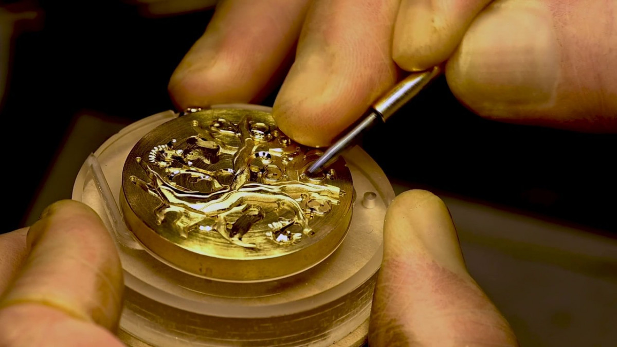 ▲贵朵45周年立体金雕纪念怀表在厚度仅有1.85mm的空间当中,金雕的树木利用细微的高低差表现出弧度以及深度,同时还呈现出树木特有的扭曲螺旋造型。