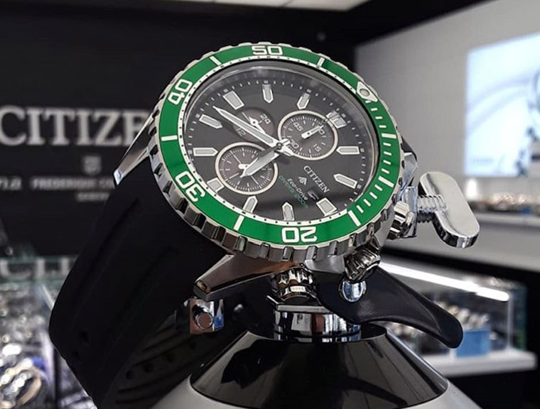 CITIZEN的CA0715-03E搭载单面防眩光强化玻璃与200米防水,并搭配多功能计时面盘,增加更多专业功能让潜水表的实用性再提高。CA0715-03E选用极具运动风格的黑色橡胶表带,表面上亮眼的环状经典绿色表圈与面盘的黑色完美接合,让整只表在沉稳中多了些清新感,不只适用于户外运动型穿搭,只要是非正式场合都可轻松上手,尤其现在有绿色点缀的潜水表在市场上特别讨喜,CA0715-03E吸引人的地方不仅在于功能及规格上都有水准以上的表现,它的价格也是比较偏向石英表本质上那种亲切感,不过由于它具备复杂功能,本来还以为价格应该会稍微高一点,但其实这款定价2万元有找,在拥有200米防水性能的潜水表作品中,可说是CP值非常高的一款手表。