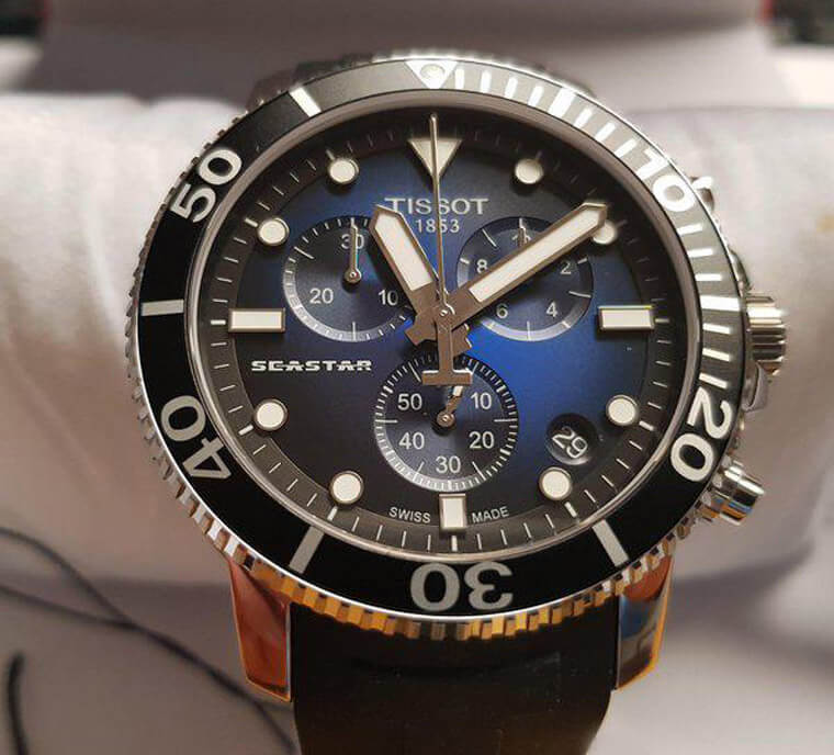 2019年Seastar 1000系列再接再厉推出搭载石英机芯的计时款,除了同样有渐层蓝面的款式外,品牌还推出了更多不同配色材质与面盘的款式可供挑选,希望能延续上一年的热度。新款的Seastar 1000潜水计时表表径比起三针机械款略微扩增至45.5mm,材质还是一样耐操的不锈钢,主打款蓝色渐层面盘尤其能突显出手表和海洋的渊源,手表面盘上的细节跟三针款大同小异,不过由于多了计时码表功能的关系,整只表的正面看起来也变得更丰富了,例如小秒盘位于六点方向、两点方向和十点方向则分别是计时盘和计分盘;原本机械大三针款位于六点方向的日期显示,到了石英计时款身上则被挪到四~五点方向之间,日期显示盘依旧是黑底白字,对应面盘外圈是从蓝色到深蓝色的渐变色彩。