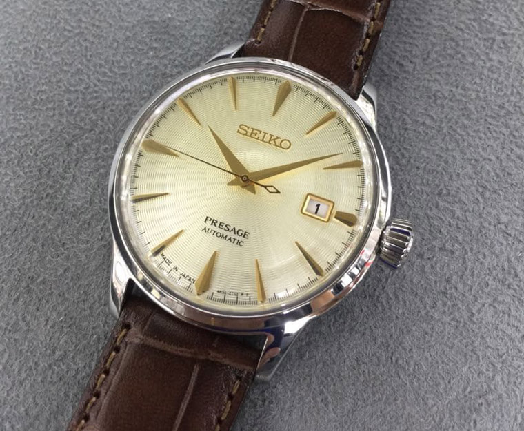 目前SEIKO的Presage鸡尾酒系列共有动力储存显示款式和大三针款式两种(附带一提三针款还有表径设定在33.8mm的女款),价位都在两万或以下,而且面盘不只是精致的纹路,结合不同口味的鸡尾酒,更是让这系列的面盘配色选择性非常丰富。以SRPC99J1为例,淡金色的面盘让人联想起香檳鸡尾酒,不锈钢表壳搭配金色调的时标、指针与日期窗框,低调中带有一点高雅气质,而且注意到它的面盘细节都有立体切面——这种细腻的做工正是日本表受人欢迎的原因之一。表背为透明底盖,表款搭载的4R35机芯连自动盘都镀上金色,让人看了赏心悦目,而且4R35机芯的优点还包含了Magic Lever上链机制、游丝以具备高度耐力的Spron合金制成外加品牌特有的Diashock避震系统,别看手表价位是入门级别,以规格条件来看,这也算是入门机械表裡面诚意满档的配置了。