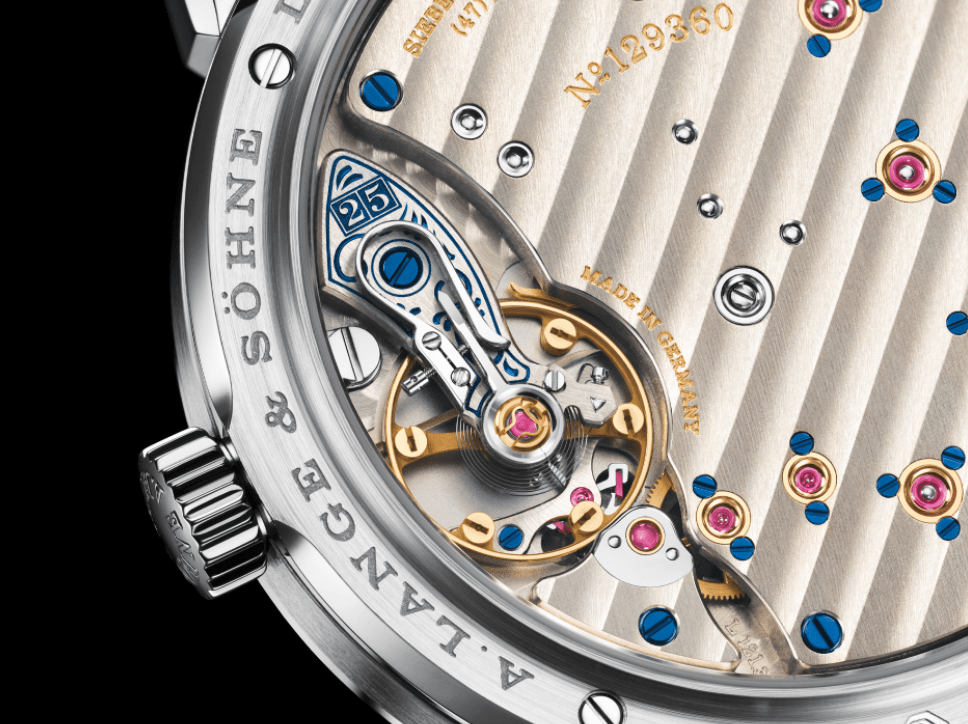 ▲一如25th Anniversary系列的其他表款,手工雕刻蓝色摆轮夹板上缀以周年纪念数字"25"。此数字的排列和方式更与所有照片中朗格大日期显示的数字"25"互相呼应,亦象徵着所有周年纪念表款的限量数目。