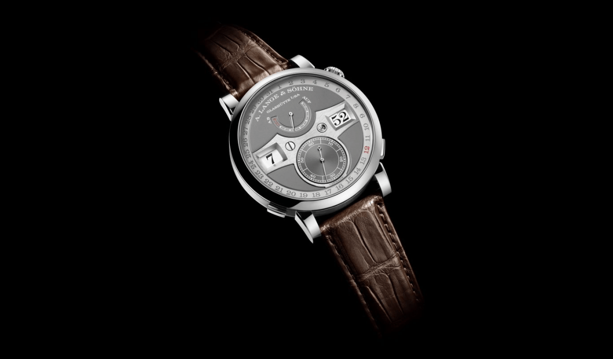▲Zeitwerk Date配备直径44.2毫米的18K白金表壳、灰色面盘和红色日期。