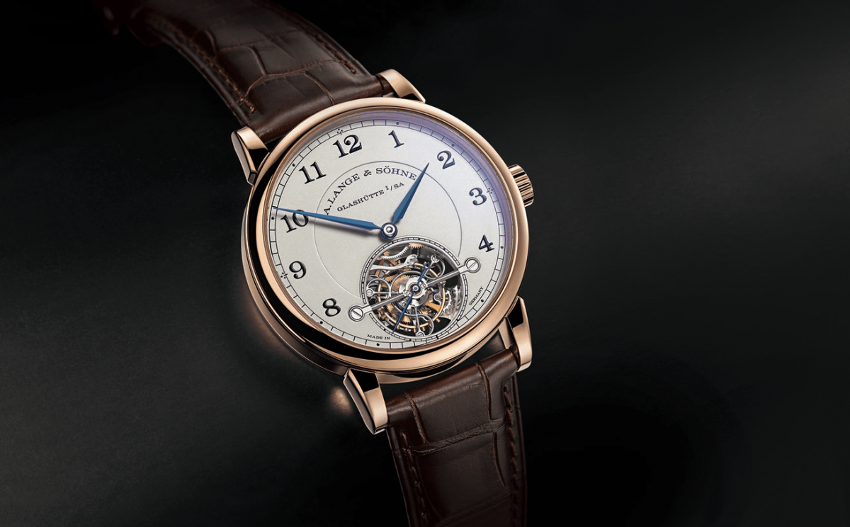 ▲一分钟陀飞轮的轴心附有蓝钢小秒针,阿拉伯数字与经典火车轨分钟刻度的组合让人联想起历史悠久的朗格怀表。
