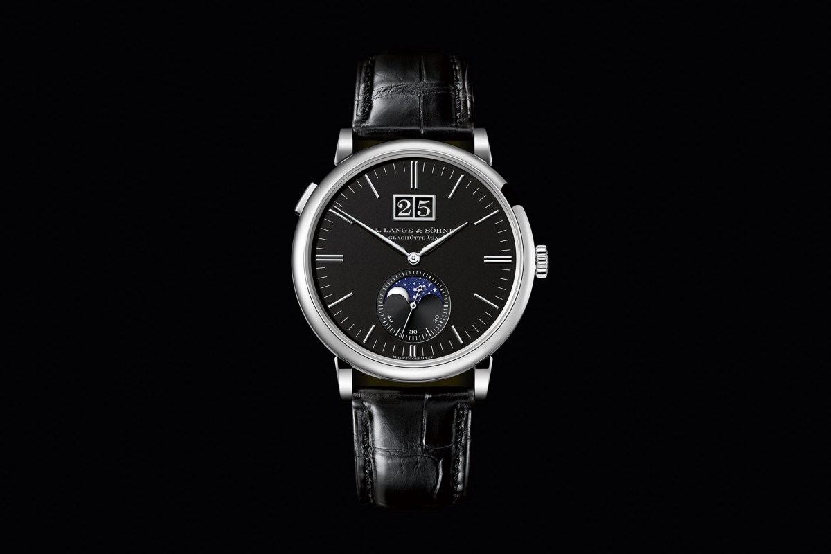 焕然一新的Saxonia Moon Phase以黑色面盘配衬18K白色黄金或18K玫瑰金表壳。这只自动上链手表在技术和美学方面皆引人入胜,更结合高度精确的月相显示和朗格独特的大日期显示,突显手表简洁的设计。作品具备两个经典复杂装置——缀以852颗星星、精确度长达122.6年的月相显示及朗格标志性大日期显示。最新推出的型号一改过往设计,因应黑色面盘,以白色日期数字衬托黑色背景。大日期显示和具备月相显示的小秒盘,位处垂直轴的中央,令整体设计更显流丽优雅。