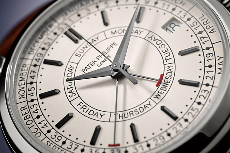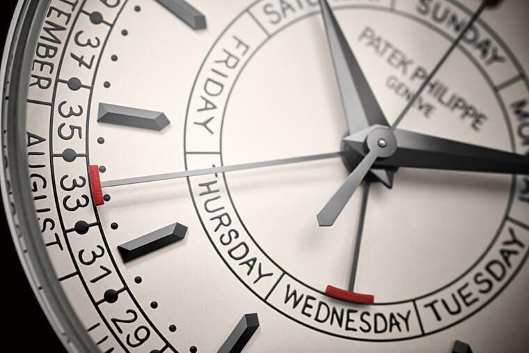 ▲除了时、分、秒针之外,百达翡丽同时在面盘中轴另外设置星期指针与周历/月份指针,后两者特别採用红色锤型针尖设计以区隔不同时间单位。