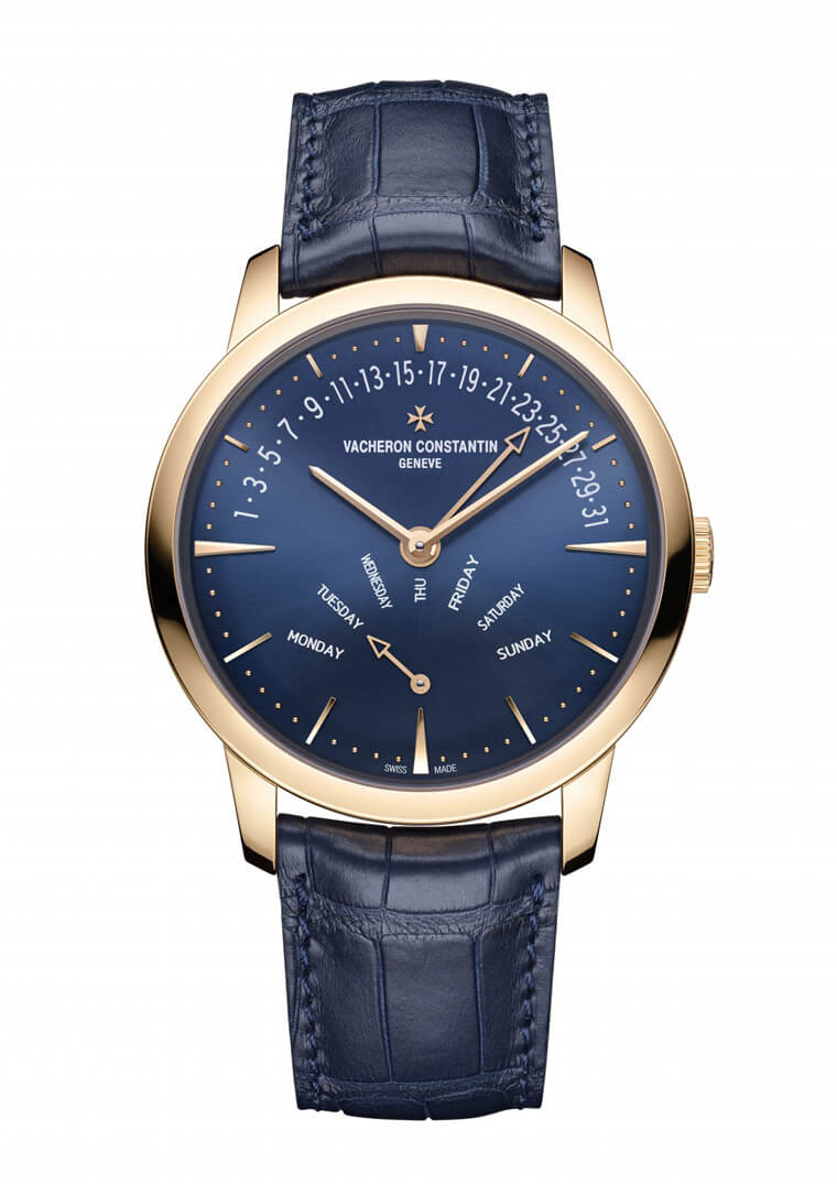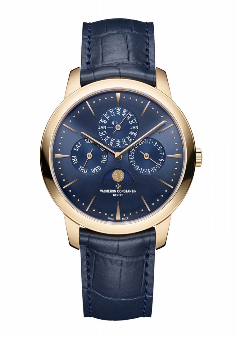 此系列2019年是第一次推出所谓的「午夜蓝」系列新品,四款手表延续了该系列一贯的纯粹简约风格,18K 5N玫瑰金圆形表壳勾勒出午夜蓝旭日纹缎面拋光面盘,纤细的棒状指针随时间的流转缓缓滑过18K 5N玫瑰金镶贴式时标和珠粒式分钟刻度圈。其中手动上链手表搭载1400手动上链机芯、自动上链手表搭载2450 Q6自动上链机芯,两款表均拥有约40小时的动力储存。至于功能更进阶的Patrimony传承系列逆跳星期日历表配备2460 R31R7/2自动上链机芯,拥有小时、分钟,逆跳星期和日期显示功能;Patrimony传承系列超薄万年历手表搭载超薄自动上链1120 QP机芯,可驱动小时、分钟、月相、万年历显示功能。