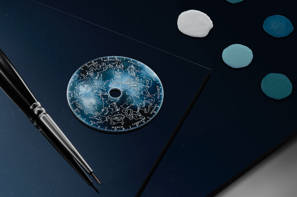 ▲星空图呈现积家发源地汝山谷的夜空,实时显示星座位置的变化。圆盘与星空同步逆时针时刻转动,周期为23小时56分4秒,等同地球自转一周所需时间。