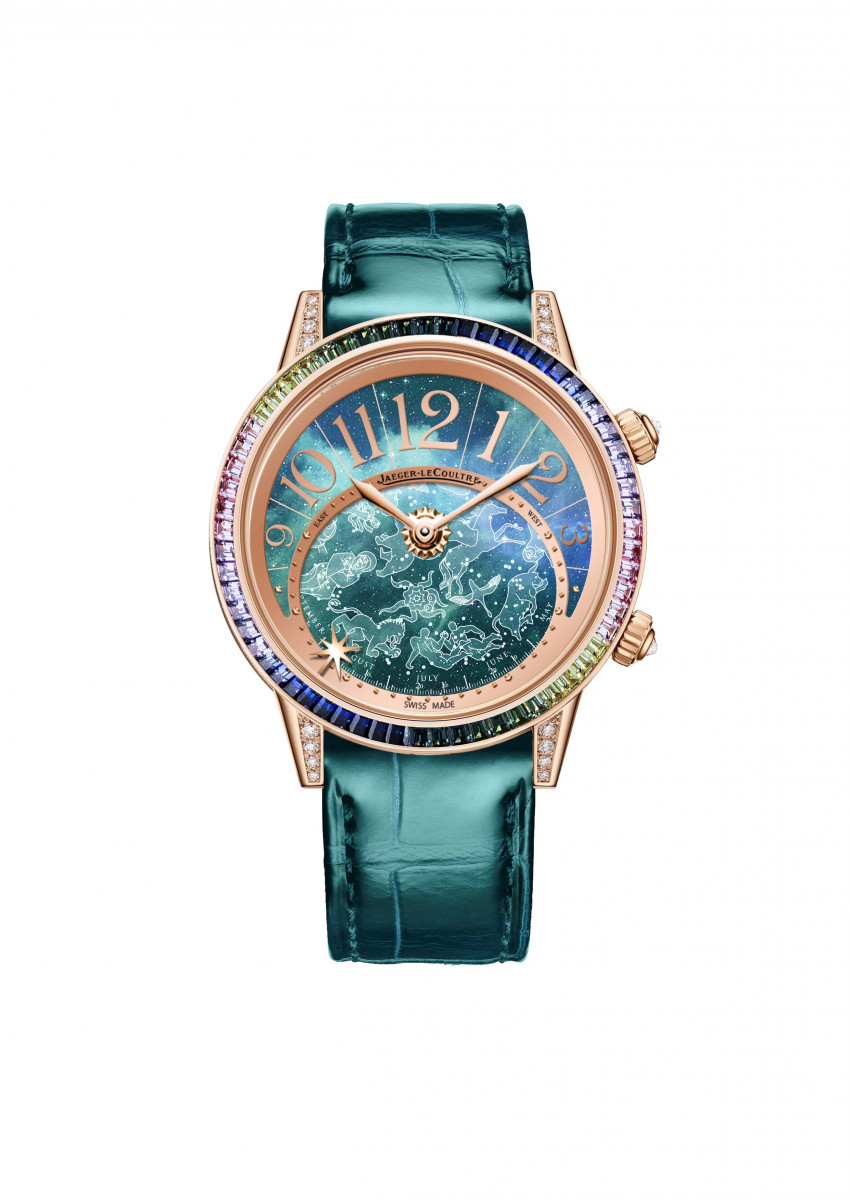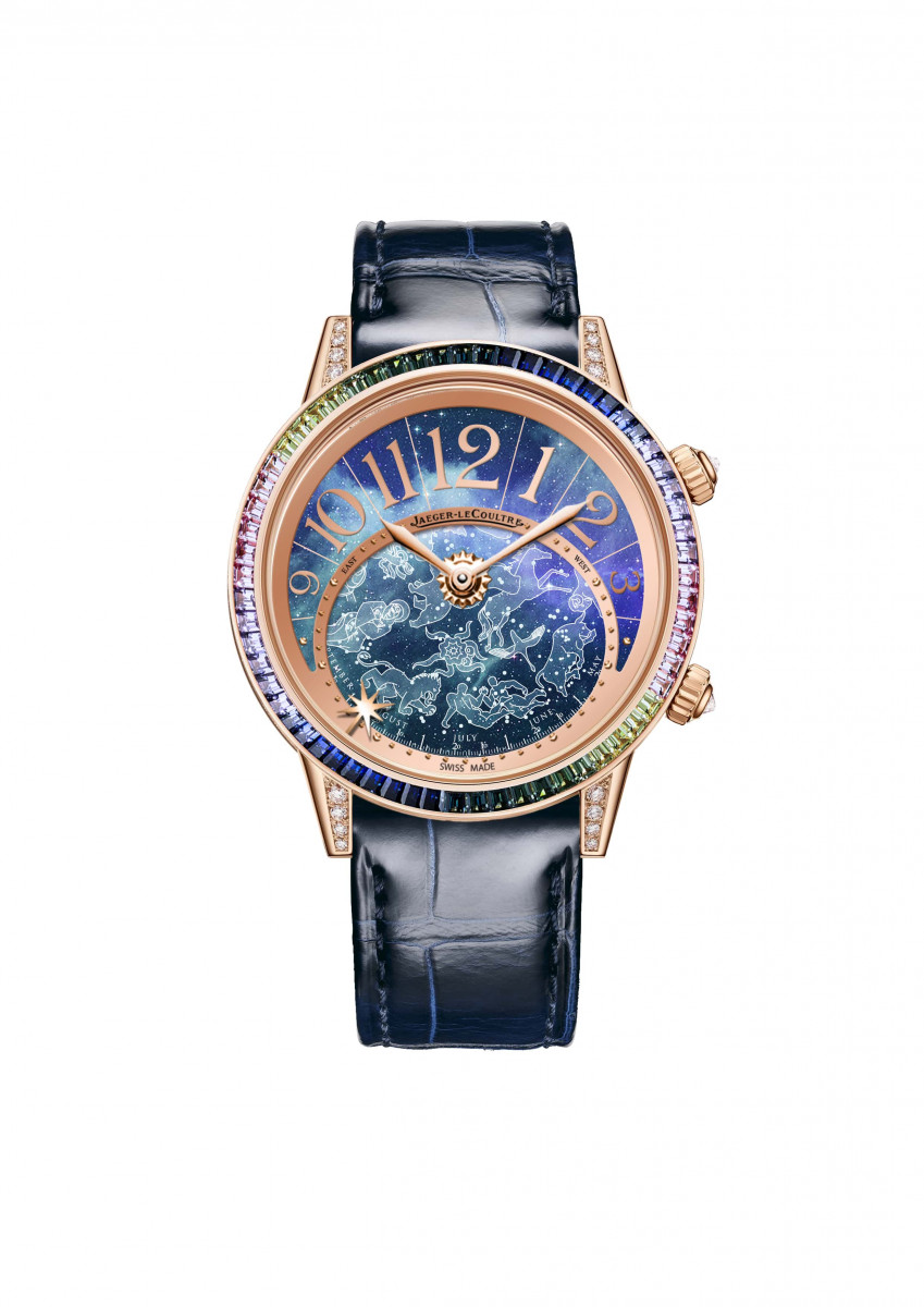 这款全新「北极光」表款以珍珠母贝和多色蓝宝石为焦点,并糅合积家的两项珍稀工艺——宝石镶嵌和手绘工艺。面盘採用不对称设计,由两个位于不同平面的部分组成。上半部分採用约会系列腕表的经典曲线花体数字,其大小呈渐变造型,于面盘下方形成弯月。下半部分以瞩目的玫瑰金椭圆环勾勒轮廓,饰以手工移印星空图,并展现黄道十二宫图案和月份名称。