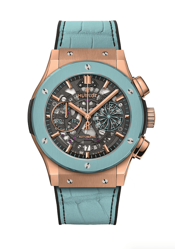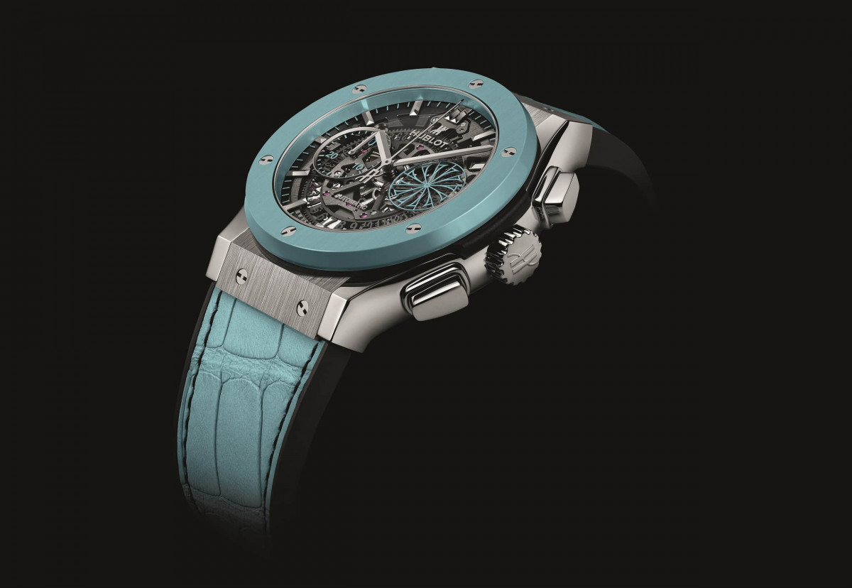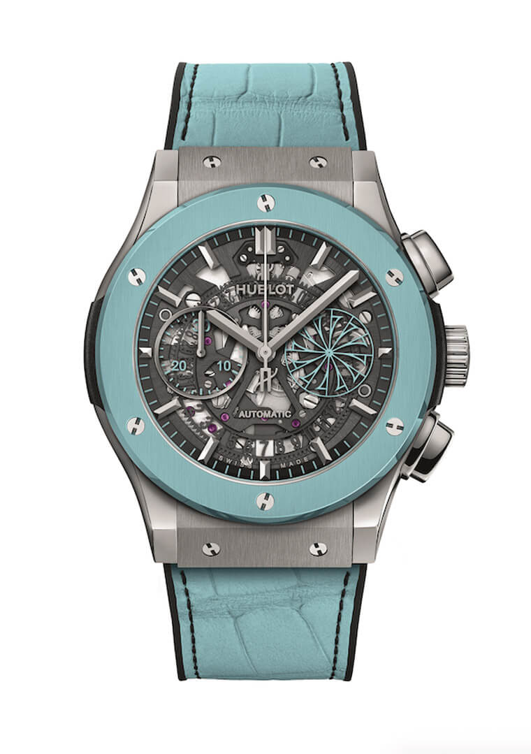 腕表搭载HUB1155自动机芯,开面设计露出机芯结构是它的一大特色,尤其日期环直接曝露在面盘上,仅在六点方向採用白色背板突显当日日期的设计相对少见,经典融合系列米科诺斯岛计时码表以创新材质结合当地地标,将晴空蓝结合各种金属阐述「融合的艺术」品牌精神,搭配黑色橡胶与晴空蓝鱷鱼皮表带内衬宇舶特有黑色橡胶表带。品牌标志刻印于蓝宝石透明面盘之上。