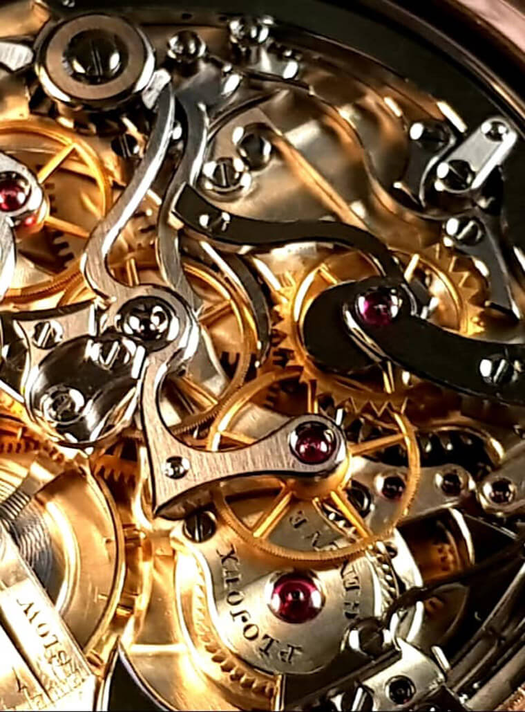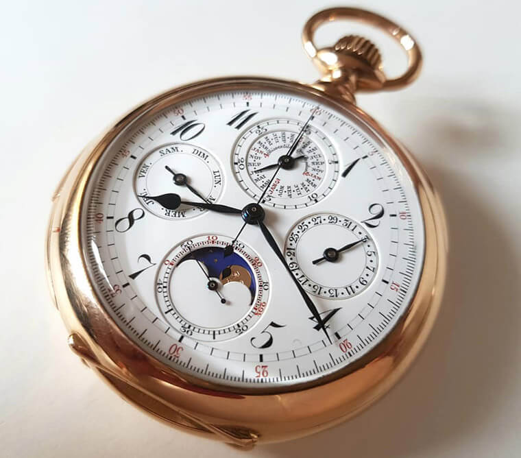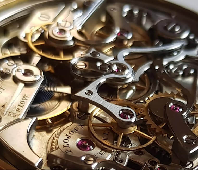 Roger收藏的这只怀表(如上图所示)约在1910年生产,面盘没有署名,机芯内打上”POLJOUX”,属于一款非常顶级的复杂怀表,因为它具有三问报时、万年历与计时功能等多项复杂功能,重点是品相相当不错。而这款表的特色还包括三问的减速装置採用高级的槓桿式(目前三问手表几乎都是採用飞轮式)、具备瞬跳万年历机制,也就是说它在晚上换日时可瞬间弹跳,尤其过了12月31日,可在一秒内同时跳过日期、星期、月份还有年份,看起来超级爽心悦目。这款怀表在计时机制部份,轮系多了一枚转换轮与双层齿轮,可让计时运作较为省力,操作也更顺畅。擒纵机制的定向游盘与擒纵叉等,均有镜面拋光,所有零件都有高级的拉丝与倒角处理。最后在月相部分,它的月相盘为珐琅材质,月亮图案也是K金材质,用料相当扎实。