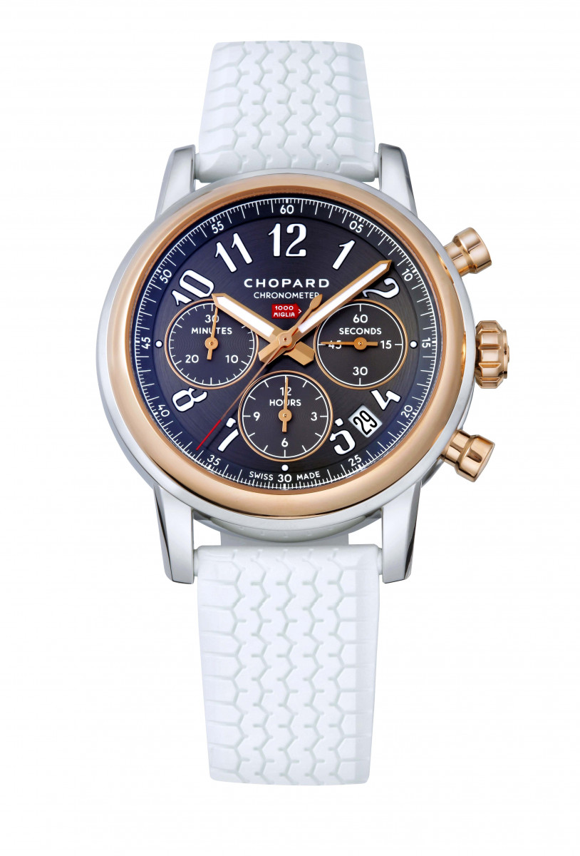全新计时码表的创作灵感源自曾在1927-1940年间驰骋于Mille Miglia古董车赛中的竞赛用跑车。萧邦Mille Miglia Classic Chronograph计时码表的不锈钢玫瑰金表壳,配备传统的双计时按把和槽纹表冠,展现出古典码表的独特风尚。面盘上的阿拉伯数字硕大显着,并与指标一样能在黑暗中发出萤光,因此具有完美的清晰易读特性;轻盈细致的草书字体以及累积计时盘的设计,参考1920年代的赛车仪表板,强烈的对比效果,使其格外醒目突出。