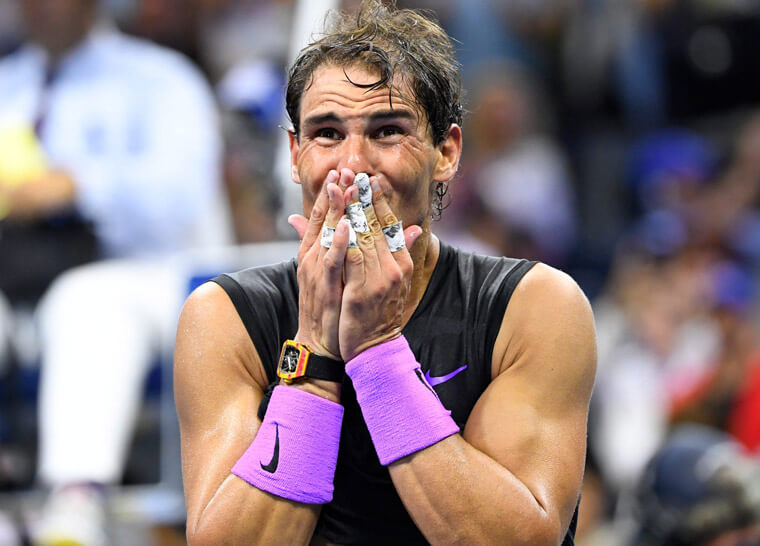 ▲西班牙蛮牛Rafael Nadal在2019年的美国网球公开赛男单决赛中鏖战五盘摘下个人第四座美网冠军,手上再度佩戴RICHARD MLLLE替他量身打造的RM 27-03陀飞轮。图片:cbssports.com