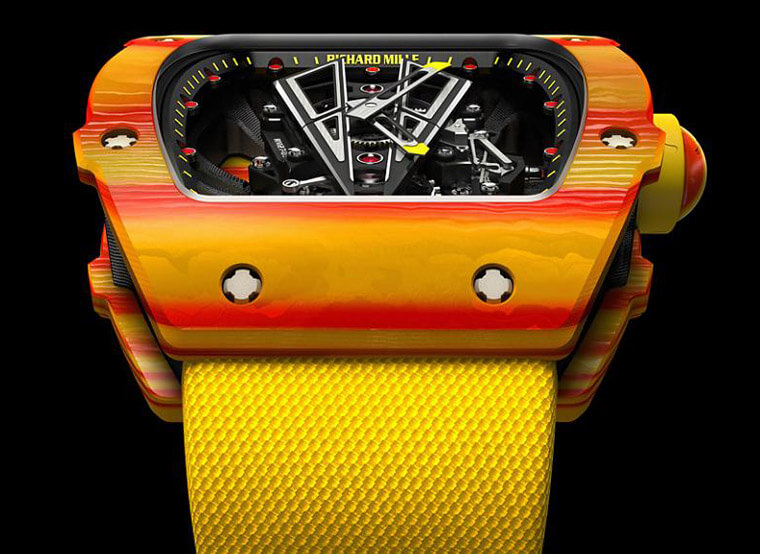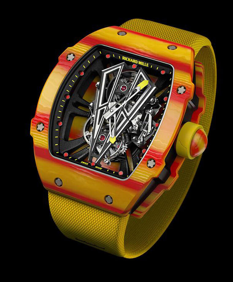 至于Nadal近几次夺冠,手上都少不了合作手表品牌RICHARD MLLLE研发的RM 27-03,这款表的外观由红⿈⾊调TPT®⽯英材质制成,象徵蛮牛来自西班牙的文化背景,RICHARD MLLLE在制作过程中是先将仅45微⽶厚的⼆氧化硅薄层浸入彩⾊树脂,将细丝交错织成薄层,之后加热至120°C,呈现艳丽夺⽬的⾊彩。而在手表的机械结构部分,RM 27-03的陀飞轮机芯建构在镂空⼀体式的TPT®碳纤维底板上,它的快速上链发条盒提供持久动⼒,运⾏时长达70个⼩时,而且考量到Nadal必须真的将它戴上场实战,所以手表的结构事前经过实验可以承受⾼达10,000g冲击⼒,这解释了在网球运动中必须激烈挥动手臂的情况下,RM 27-03还是可以维持正常运作的稳定品质,此外手表还有个特别的地方在于正面桥板的镂空造型其实是含有⽬视前⽅的公⽜形象,藉此来呼应Nadal个人专属用表的身份。