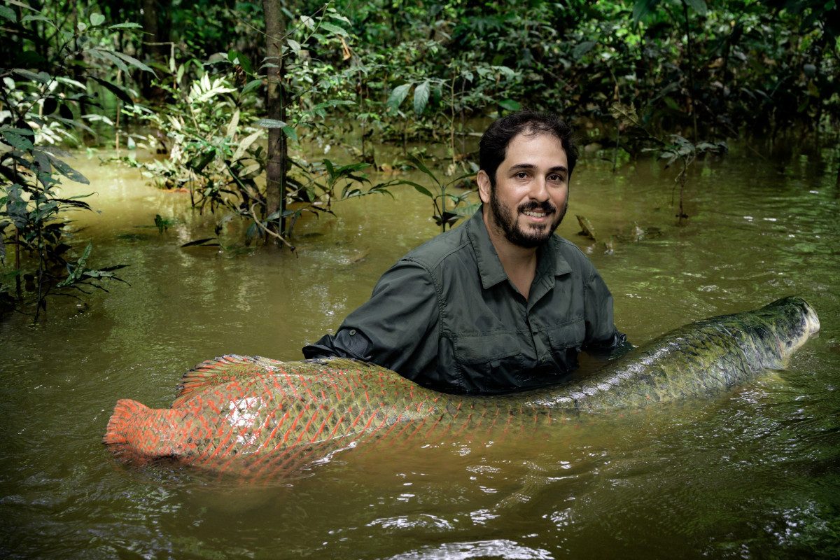 ▲祖奥·坎波斯·席尔瓦抱着一只中型的巨骨舌鱼,其体重约60公斤,此种鱼类最重可达200公斤。
