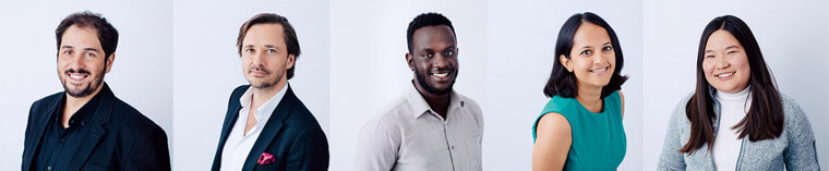 ▲左起为劳力士2019雄才伟略大奖的五位得奖者:João Campos-Silva、Grégoire Courtine、Brian Gitta、Krithi Karanth和Miranda Wang。