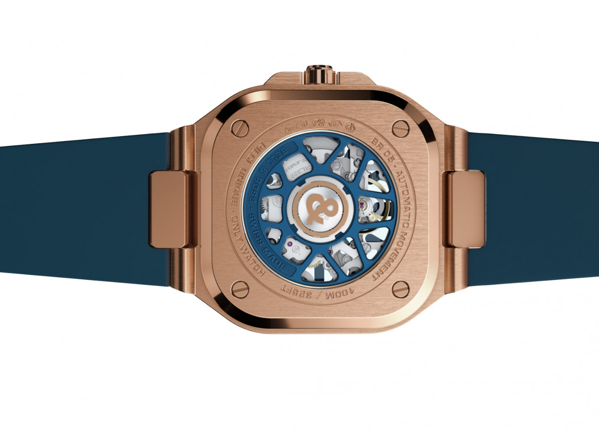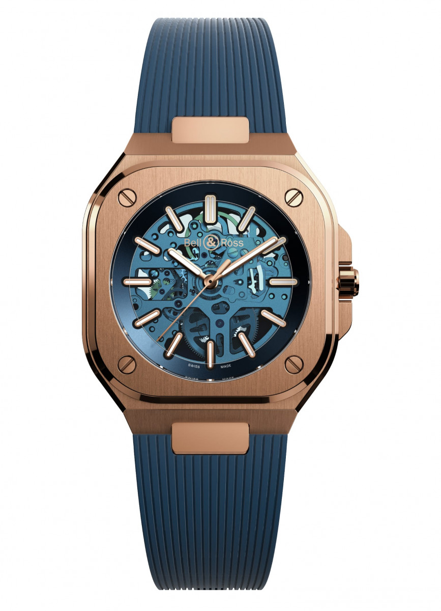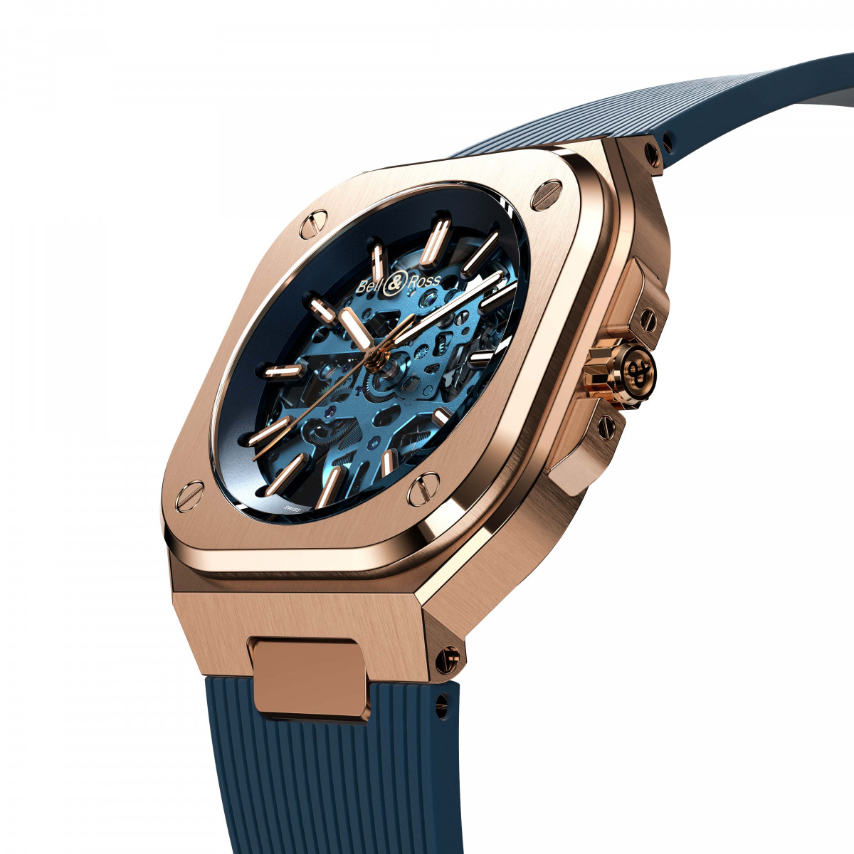 Skeleton Gold Blue手表採用18K玫瑰金表壳与染蓝色蓝宝石玻璃面盘对比强烈,面盘镶饰玫瑰金时标,透视镂通机芯结构;琢面指针及时标经Superluminova®夜光填料处理,无论光暗环境无碍清晰显示功能。手表搭载BR-CAL.322自动上链机芯,镂空自动盘还能透视机芯精美造工。