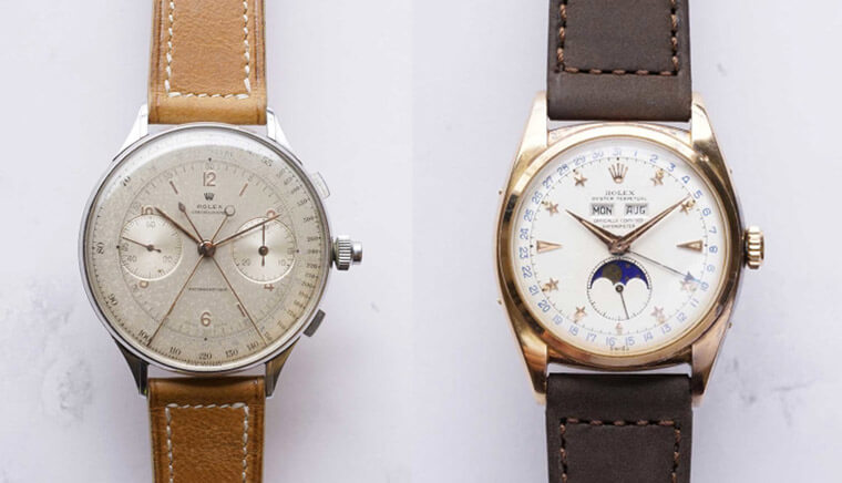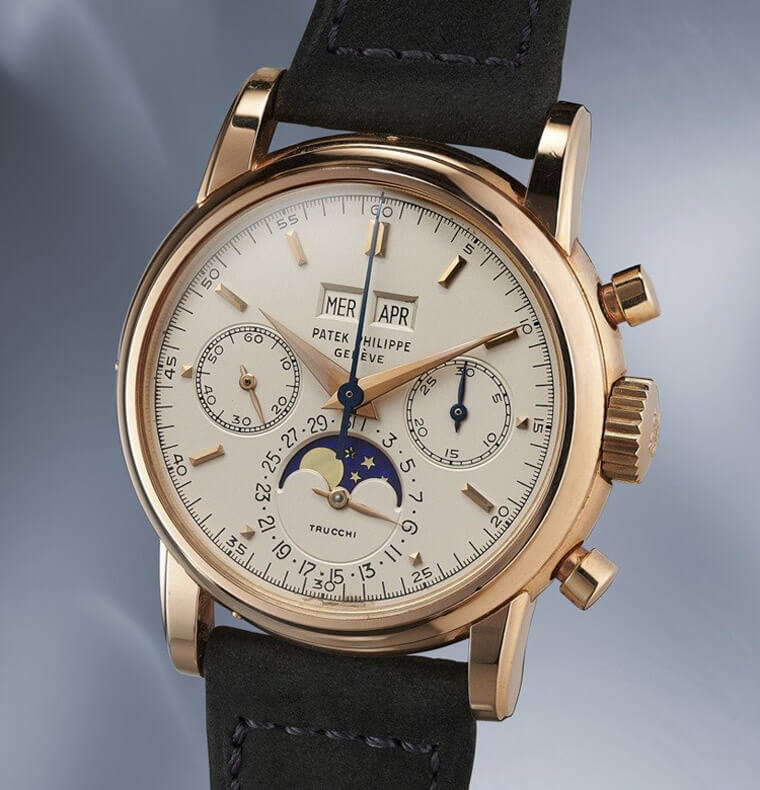 而在11月9日当日还有一场名为”Double Signed”的主题拍卖会,顾名思义富艺斯拍卖行是锁定那些手表品牌和零售商所发行的联名款式,此主题拍卖中最受瞩目的手表为百达翡丽的2499玫瑰金万年历计时码表,从月相盘上印有的”TRUCCHI”字样显示出这是PP和义大利表店Trucchi合作发行的复杂手表,虽然手表曾经被换过镜面和面盘,但那都是出自原厂之手,而且它还可能是现存唯一一款的2499,因此拍卖行情依旧水涨船高,预估价约120万瑞郎(约合台币3700万)。