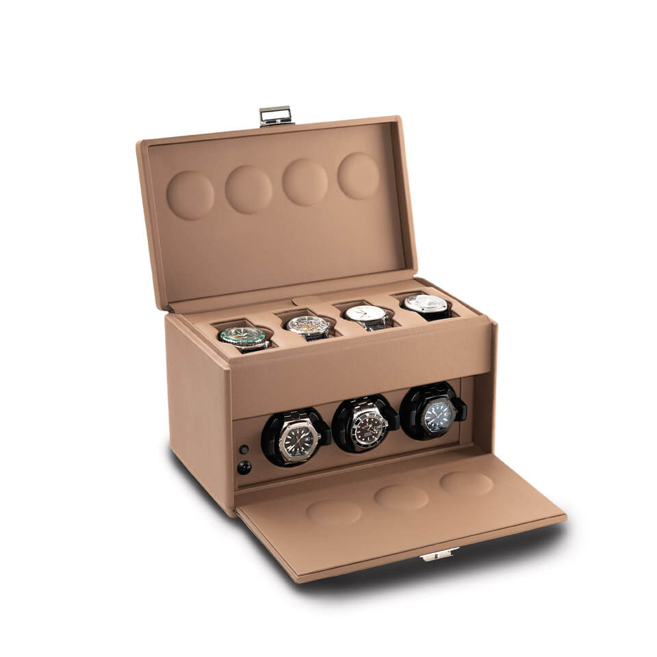 SCATOLA del TEMPO 1990 年创立于义大利,他的创办人 Sandro Colarieti 是 Patek Philippe 百达翡丽的超级爱好者,他的创立就和多数藏家一样,希望为自己的爱表打造实用与工艺兼具的上链盒。 Sandro Colarieti 靠着他丰富的知识不断精进,最终获得 Patek Philippe 的青睞,指名购买SCATOLA del TEMPO的自动上链仪,也顺势打响 SCATOLA del TEMPO 在表圈的知名度。