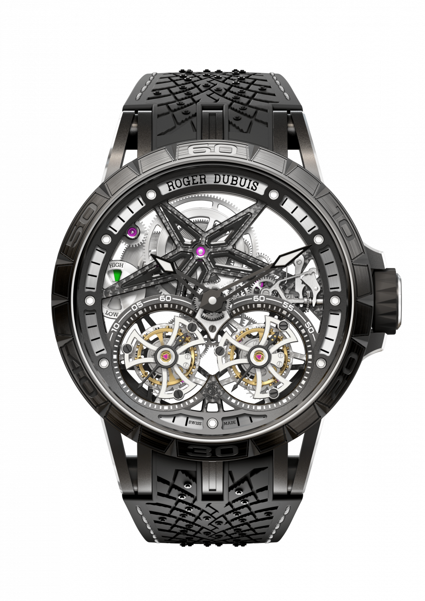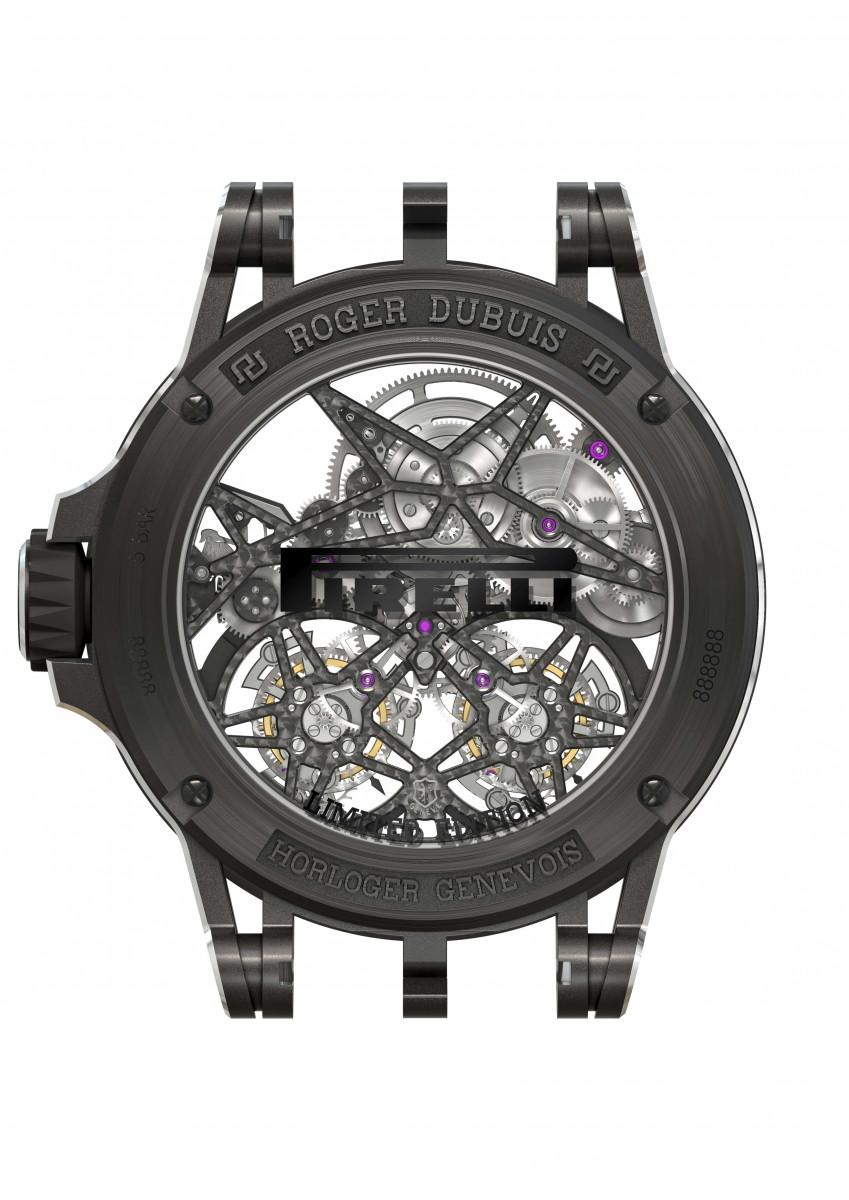 此只独一无二的手表由罗杰杜彼与素有轮胎之王之称倍耐力所共同打造而成,配备双飞行陀飞轮和47毫米直径DLC涂层钛金属表壳,动力储存达52小时。其表带复制了倍耐力专为冰雪赛道所设计,镶有钢钉的全新轮胎花纹。手表具备独树一格的运动美学和品牌闻名遐邇的镂空设计,其所搭载荣获日内瓦印记认证的RD105SQ机芯并配有高级钟表领域中的高端复杂功能——双飞行陀飞轮。