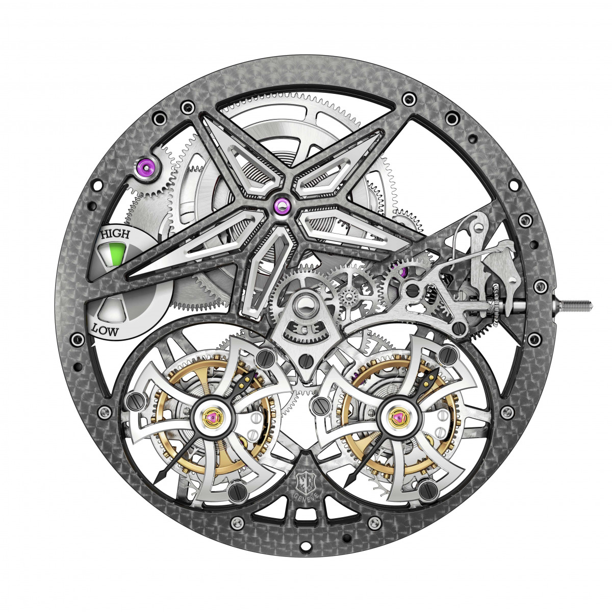 ▲手表搭载RD105SQ机芯,镂空机芯有镀銠星状造型装饰,覆有NAC涂层的圆形粒状主夹板和桥板,飞行陀飞轮框架则是具有品牌代表性的塞尔特十字造形。