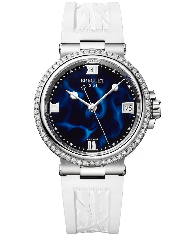 2019全新的Marine Dame 9518航海系列仕女钻表,在体现远渡重洋的毅力外,更以变化莫测的迷人光晕、魅惑人心。白金款以淡蓝色珍珠母贝面盘,饰有海潮风格的手工鐫刻,自动盘镶嵌同色的手工鐫刻珍珠母贝,表圈镶嵌50颗圆形切割钻石,绽放耀眼光芒。而不锈钢材质的款式,饰以蓝色的漆面面盘散发出魔幻的光泽之美。不同角度欣赏时,面盘犹如一面未知的海洋,蕴藏了人类已知和未知的全部祕密。表圈镶嵌合计60颗总重0.846克拉的顶级美钻,而表壳侧面更饰有象徵富裕的钱币纹,集古典美学与先进工艺于一身。