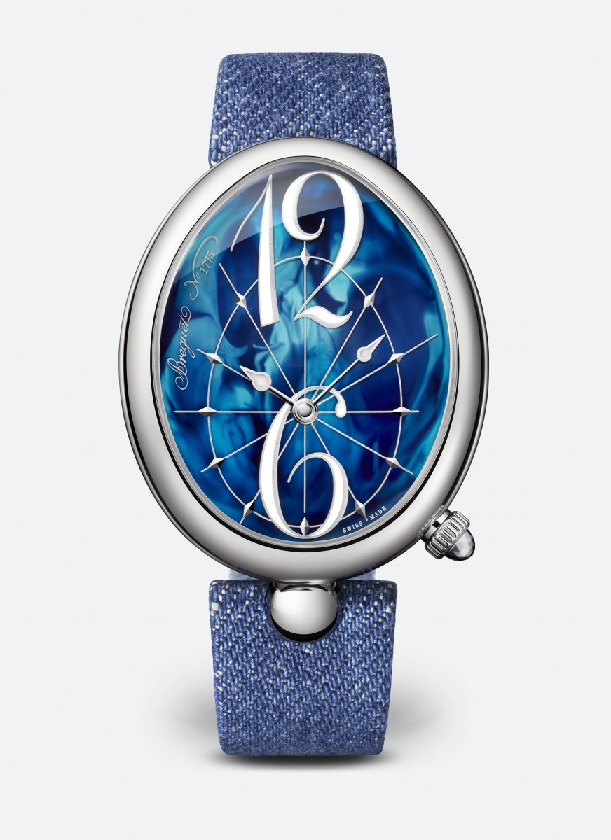同样为女仕增添魅力的,尚有Reine De Naples 8967那不勒斯王后系列时尚公主不锈钢表。以鹅蛋形优雅线条见长的Reine De Naples系列问世于1812年,不仅是部分人公认的第一款手表、更堪称「皇后之选」。新一代的8967手表,承继了19世纪的婉约并添增以当代优雅:除了硕大变形的阿拉伯数字时标富有Art deco装饰意味,鹅蛋形蓝色漆面表盘更展现了几何魅力。再搭配单寧牛仔表带之后,在严谨和随性、晚宴与派对间,达成了优雅平衡。
