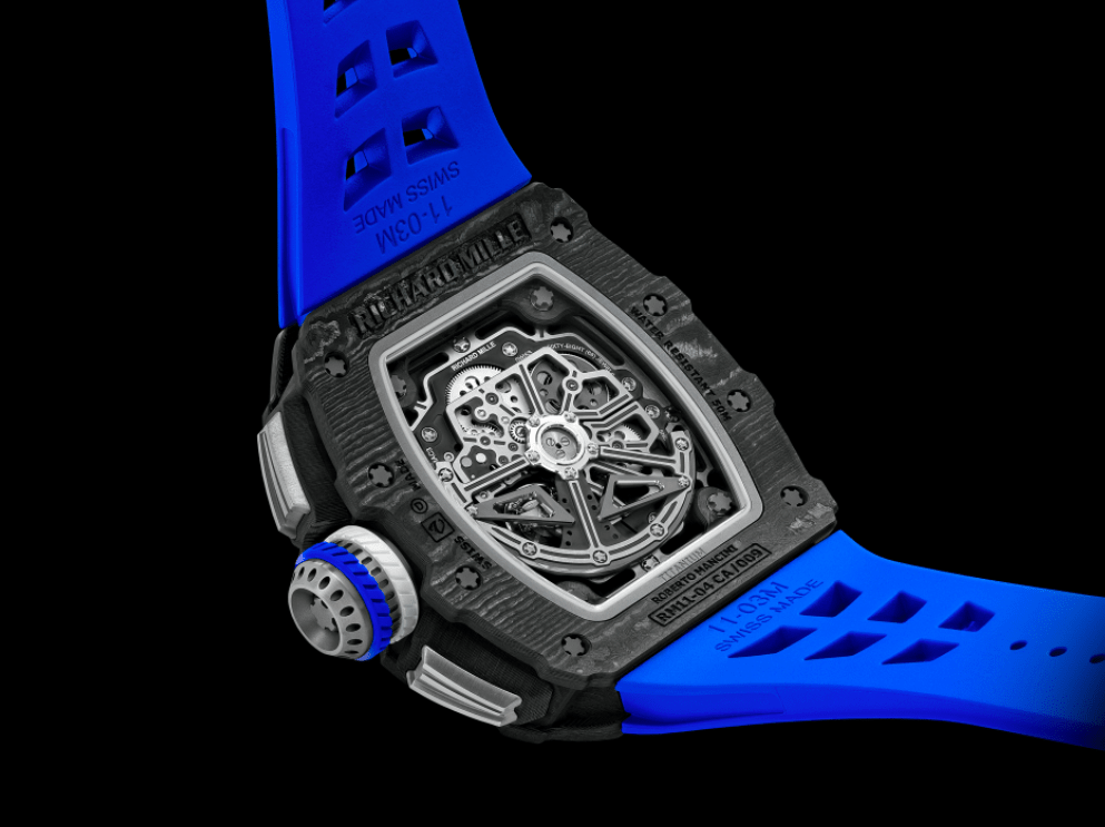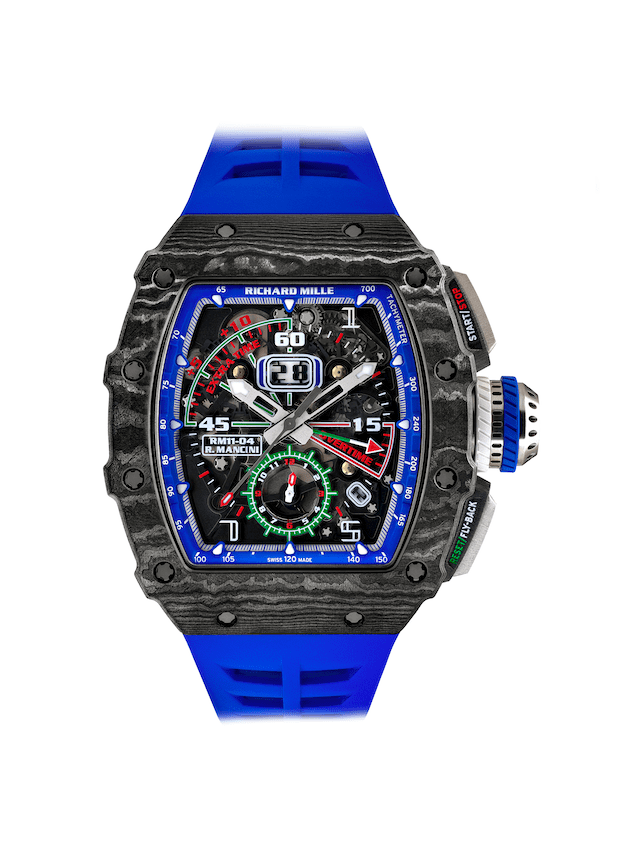 RM 11-04 Roberto Mancini腕表不仅点缀有义大利国旗的三种色彩,还饰有义大利国家足球队(Squadra Azzurra)所特有的蓝色调,都是致敬Roberto Mancini。此外,腕表的自动上链机芯亦搭载了飞返计时及年历功能。表圈、表冠和按钮盖均以精工修 饰,橡胶表带则搭配钛合金折叠表扣。