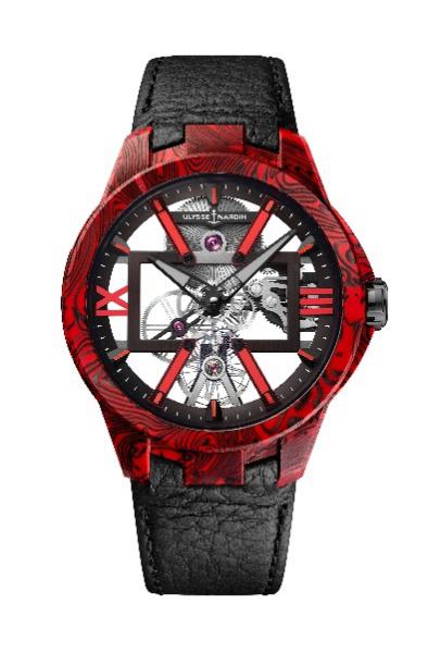 传承经理人系列的美学准则,搭配超轻型的钛金属表壳和陶瓷表圈,轻盈通透,并以流线型设计散发出时尚魅力:超大罗马数字和时标、仿若悬浮在半空中的剑型指针、以及浮腾于中心位置的深黑色长方形桥板,强调雅典表镂空系列在现今品牌中的超然地位。机芯经过精心设计的镂空结构突显独一无二的特质,同时保留令人立即识别的特色,碳纤维压纹红色真皮表带与表盘内的红色元素相得益彰,红色与镂空搭配寓意“红透了”,亦带来强烈的视觉冲击力。