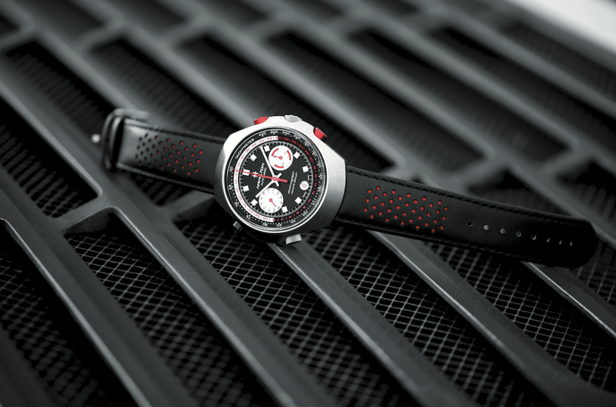 品牌设计团队为了呼应表款的速度性与复古感,更特别打造Chrono-Matic 50专属的黑红撞色赛车风格表带,表带以双层加工的方式制成,突显汉米尔顿自动计时创始品牌的极速基因。
