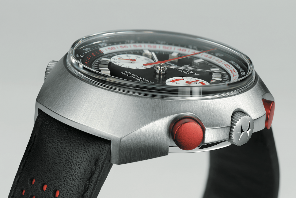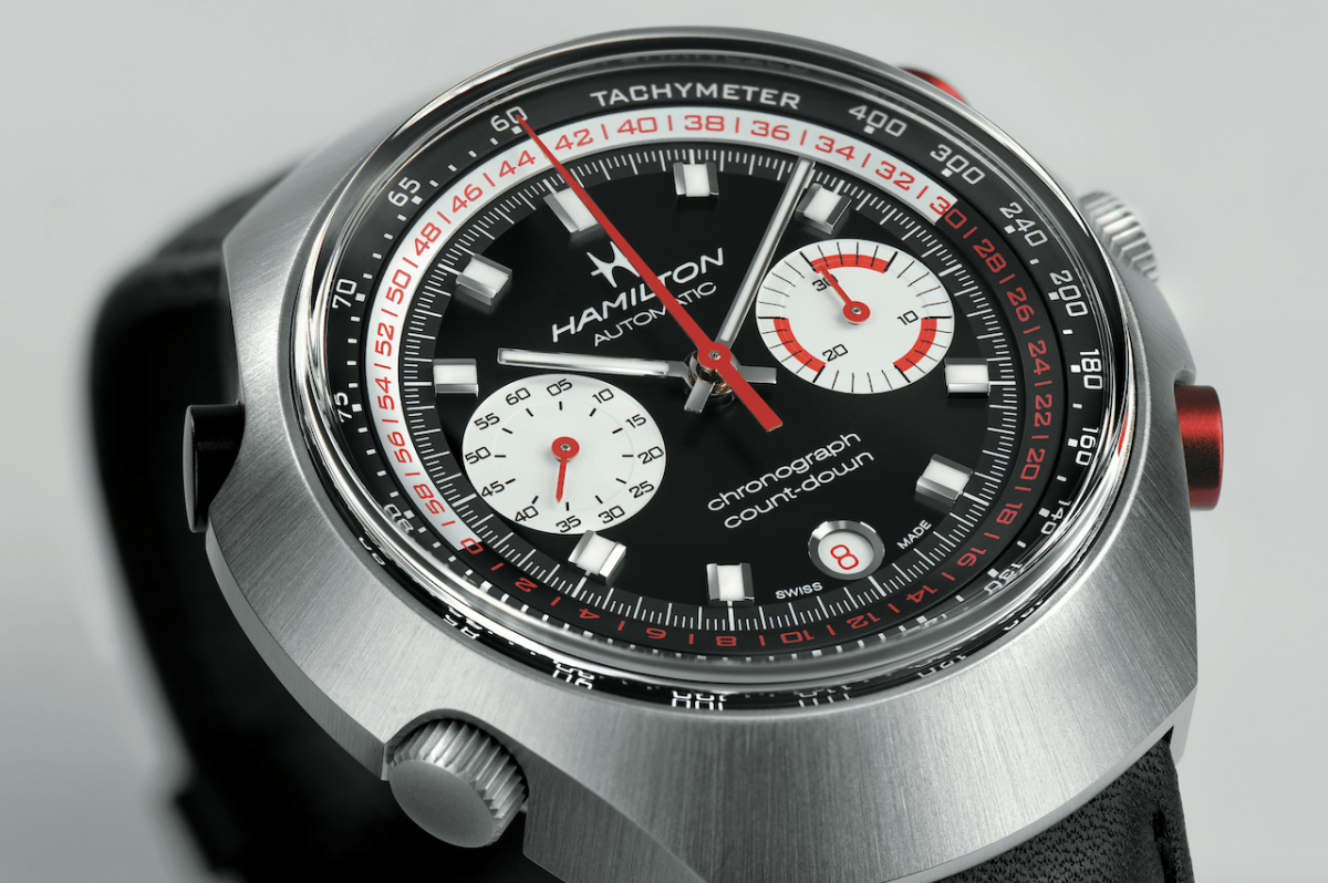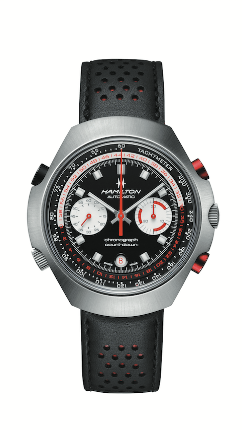 1969年,汉米尔顿与百年灵、豪雅携手技术研发,催生出全世界第一款自动上链计时码表机芯Caliber 11,强烈宣示钟表世界踏入一个崭新的辉煌纪元。为了善用全世界第一枚自动上链计时码表机芯的珍贵资产,汉米尔顿吸纳各方的意见与专业需求,同时必须做出与合作品牌的市场区隔,推出全球第一款倒数自动计时码表——Chrono-Matic E,搭载超越市场寻常表款的强大复杂功能,展现颠覆力道的奇想,成为当时科技感十足的一代经典。