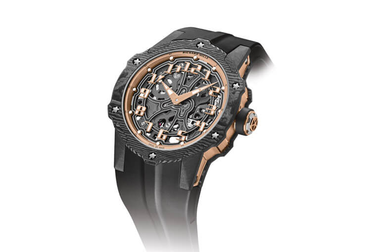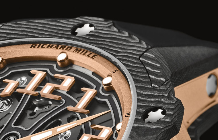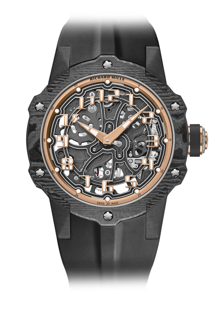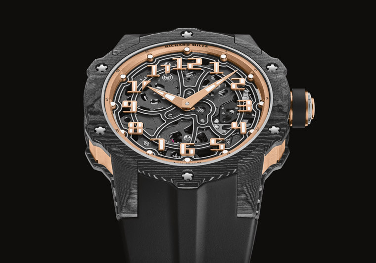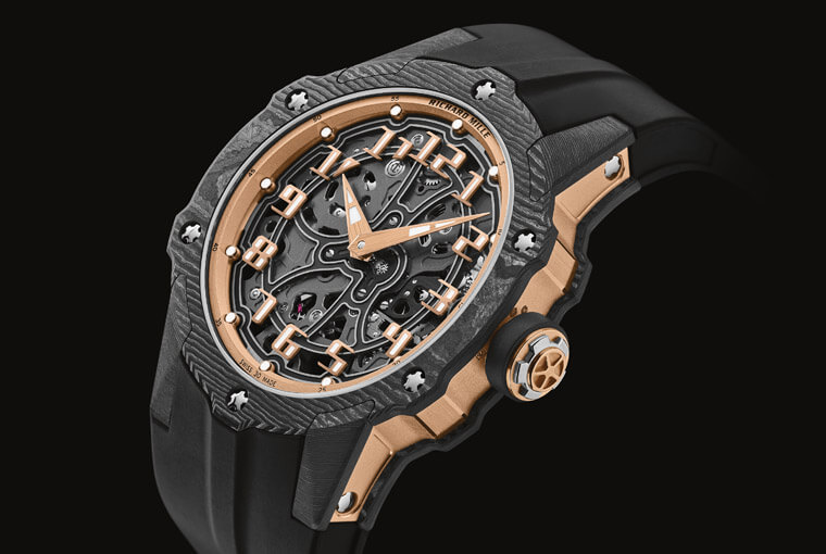 ▲除了换上带有不规则纹理的Carbon TPT®碳纤维表壳,RM 33-02的表壳造型、面盘细节等都有具体可感的细部变化,例如固定螺丝的位置、红金打造的时标,乃至橡胶表带都有随着表壳微调而改造之处。