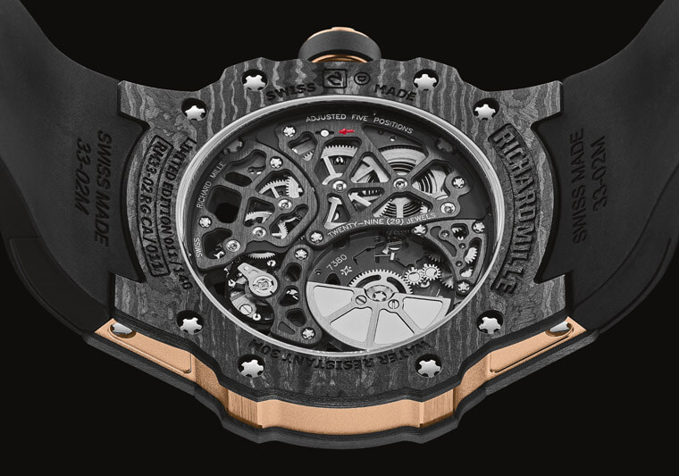 翻至表背可以一窥RMXP1机芯的精密结构,RM 33-02在底盖边缘的十二点方向刻上品牌字样,并于6点方向刻上限量编号,两处都是与RM 033同中求异的地方。至于机芯方面,依旧可以看到採用用湿喷砂和Titalyt®处理的镂空底板,从机芯零件细致的倒角、拋光或和缎光处理等可以看出品牌一丝不苟的制表工艺,此外前面提及RMXP1是一枚在RICHARD MILLE家族中显得相当独树一帜的超薄机芯,它之所以能将机芯厚度控制在2.6mm的纤薄程度,重要关键之一就在于採用了微型自动盘设计,以铂金材质制作的自动盘可以改善体积过小而伴随的上链效率低落疑虑,再者微型自动盘偏置于机芯一侧,也不会像全幅自动盘那样等于需要多出一段垂直空间需求。RM 33-02结合超薄镂空机芯以及Carbon TPT®碳纤维表壳,除了外观上看起来独特、纤薄之外,佩戴在手上的舒适度更是无须赘言。无论是RM 033或是RM 33-02都充分展现品牌追求高适应性腕表的愿景,适合每日佩戴、没有场合限制,具体而微地突显出RICHARD MILLE并非只偏重于制作某种类型腕表的多元创作观。