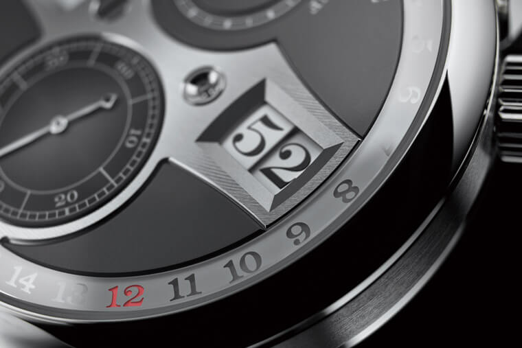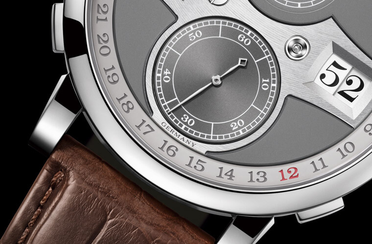 ▲ZEITWERK DATE能够透过表壳四点与八点方向的按把分别快调小时与日期,不仅节省佩戴者的时间,也间接维持腕表走时的精准度。