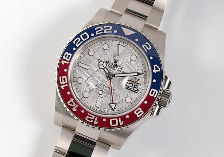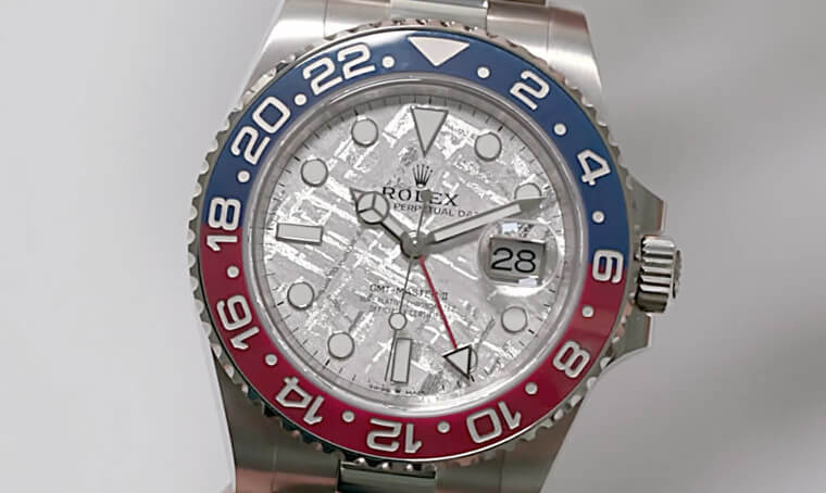 陨石面在劳力士的产品中始终佔有一定的人气,儘管时下的年轻人未必懂得欣赏,但这种特殊素材的稀少性和独一无二仍然受到资深玩家的追捧,而这些玩家正好又是金壳劳力士的主力客层,将它们(陨石面和金壳)结合在一起可以说是相当合理的选项。陨石面不但拥有每块都不相同的独特纹理,另一方面它银灰的色泽之于GMT-Master也是别开生面,历来GMT-Master搭配的都是深色面盘,如此明亮的表面搭上熟悉红蓝圈,意外地为这个老经典营造出一种崭新的印象。