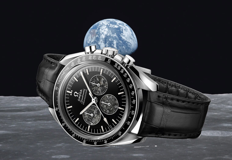 欧米茄在阿波罗11号登月任务届满50周年之际,发表了一款搭载复刻321机芯的全新表作超霸登月表铂金款,除了用珍贵的铂金来庆祝登月任务的重要里程碑,它的外观造型灵感则是来自第四代超霸(型号ST 105.012)的表壳。至于黑色表圈(陶瓷材质+白色珐琅刻度)与黑色面盘跟早期的登月表有着一定的历史渊源,不过既然是有特殊意义的纪念表,欧米茄在面盘设计上也融入了一点巧思——採用月球陨石碎片来制成面盘上的三枚小表盘,将「登月表」的精神诠释得更淋漓尽致!此外表款连时标和指针也使用了白金材质制作,高规格选材突显手表的纪念意义。