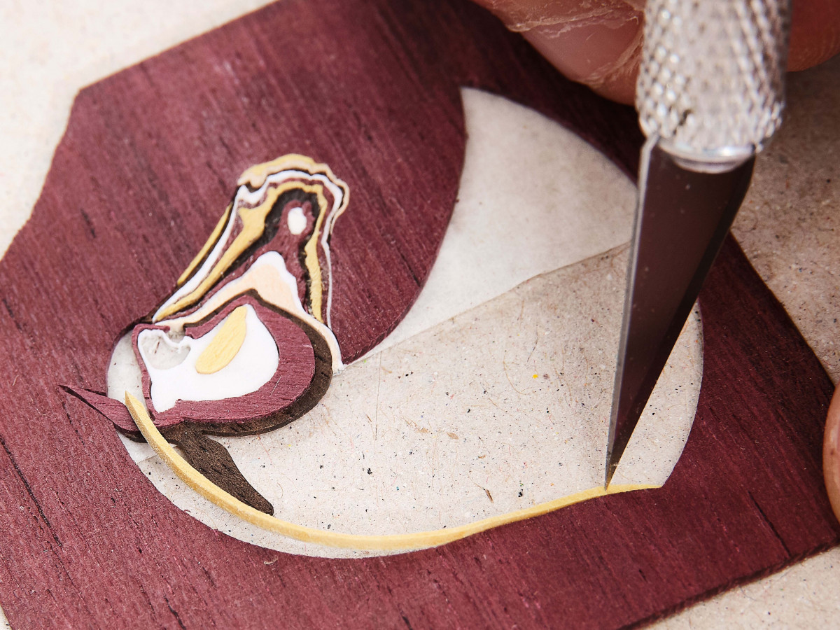 为了将这些复杂的图块与曲线转换成面盘的尺寸,爱马仕工匠得先将图案缩小。然后他们会严格筛选将成为创作媒材的质地和顏色,此作品混合了珍贵的木材,如马卡莎黑檀木、紫心苏木,以及少数的七叶树木、黄梨木和玛都那树瘤。紫心苏木是带细微粒状质地的紫色木种,它的木心原本几乎是白色的,但多年后逐渐变成深色。马卡莎黑檀木带有细微密集如黑色水晶般的粒纹质地。轻盈、柔软并且均匀的七叶树木质地是如丝般的白色。黄梨木,质地紧致且均匀,好像经过细心的拋光。