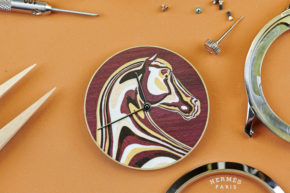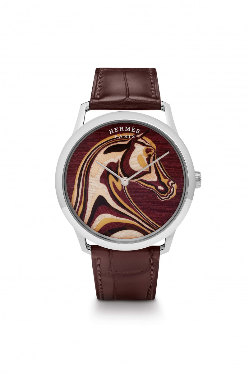 由Philippe Delhotal于2015 年设计创 作的爱马仕Slim d’Hermès手表,推出了一个全新款式,且在这款手表上呈现一个独特的专业技术:木片细工镶嵌。爱马仕的工匠运用木片细工镶嵌技术,将飞马塑像镶嵌于手表面盘上,透过木种之间的细 微差异,揭露出此飞马图像。从头部轮廓来看,它展现出轻盈、力量与祥和之美。