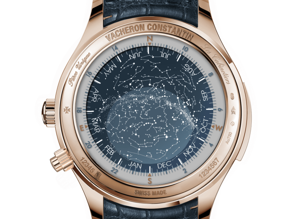 ▲表背上的星空图绘有熠熠生辉的银河和星座图案。这幅星空图以23小时56分钟为周期运转,完全符合恒星时运行规律。