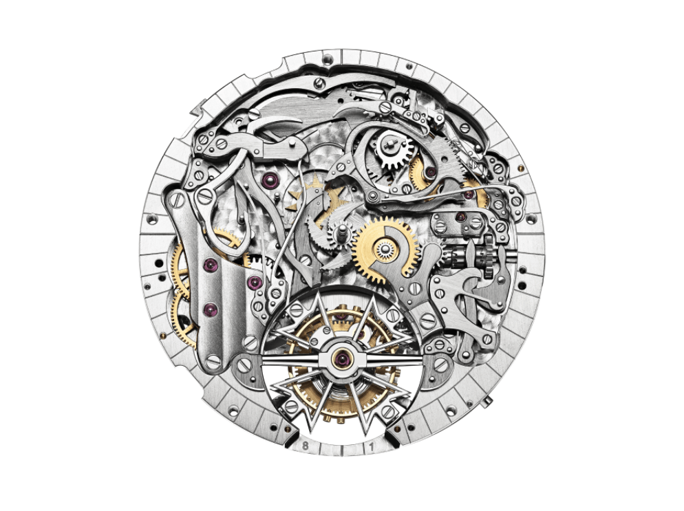 为打造此种由三问报时滑杆控制的高级复杂报时机制,江诗丹顿的工程师和制表大师从2005年推出的La Tour de l'île®周年纪念表款中汲取灵感,特别是借鉴于其鸣响调速器设计。这一鸣响调速机构可以控制音锤击打两个环形音簧的节奏,运转时能达至完全静音,让腕表以最清晰及和谐的美妙音符报出时、刻和分。因此,这款腕表也配备这一完全静音的向心性飞行报时调速器,从而避免了机械结构过度磨损。