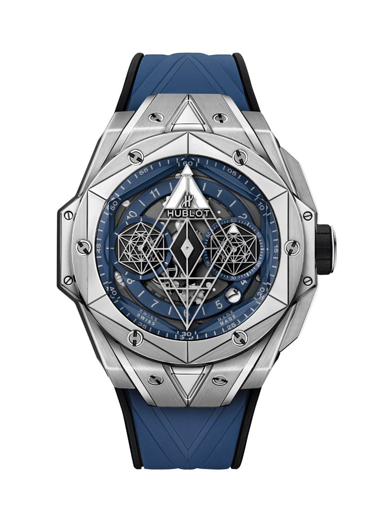 Big Bang Sang Bleu II墨蓝计时码表,诠释Sang Bleu刺青工坊创办人Maxime Plescia-Büchi在几何和立体感方面的独特主张,刺青从古老技艺跃身为全球潮流象徵,宇舶表凭藉精湛的制表技艺,再次打造创新独特的时计,亦是记录时光流转的雕刻杰作。新表均採以蓝色为主,来自Sang Bleu刺青工坊使用的墨水。蓝色面盘搭配同色表带,指标、表圈以及表壳皆以纵横交错的几何线条点缀。