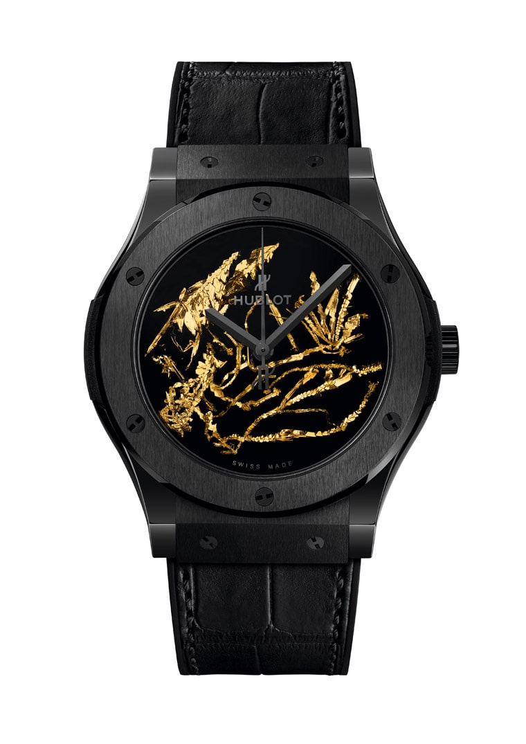 全新经典融合黄金结晶体手表面盘採用地球上最稀有的黄金型态:黄金结晶。全新经典融合系列黄金结晶体手表的面盘,以黄金薄片组成的黄金结晶所装饰,正如同精美的艺术画作需要搭配最适合的画框,手表以黑色陶瓷表壳衬托出黄金结晶面盘,共有38毫米与45毫米两种尺寸。搭载宇舶自制HUB1112自动上链机芯,具有42小时动力储能。黑色鱷鱼皮结合天然橡胶表带,使佩戴者舒适的将珍稀的艺术极品戴在手上。