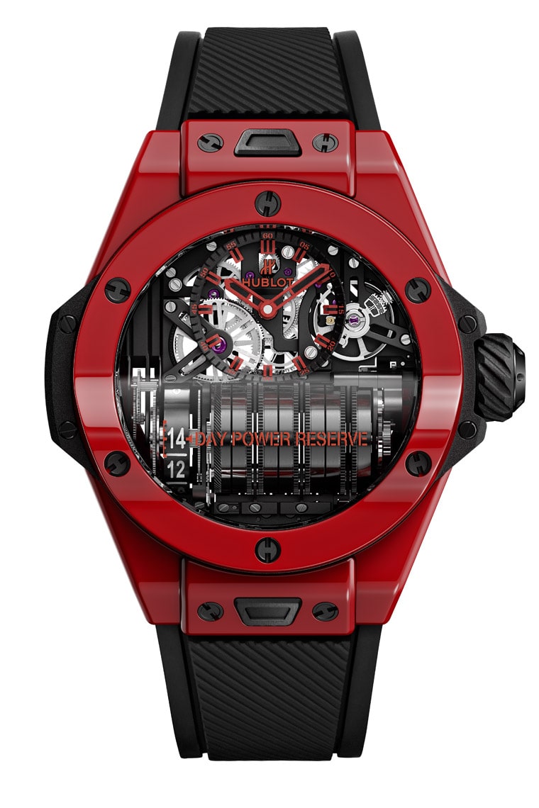 Big Bang MP-11魔力红陶瓷手表表壳,採用宇舶专利立体饱满红陶瓷,表壳与表耳採用经过完全抛光处理的鲜红陶瓷材质,与表圈上的黑色钛金属H型螺丝、黑色橡胶表冠与立体刻纹表带,形成了极大化的反差对比。搭载HUB9011机芯,具有强大的性能与杰出设计,机芯拥有令人赞叹的创新结构,透过透明面盘一览无遗。7个串联发条盒提供两周的长效动力储能。为了确保动力能够从水平发条盒的轴心传送到控制小时与分钟显示的垂直轮系,设计师们引用制表业罕见的新机制:垂直90度的螺旋式齿轮传动系统。灰黑色镀釕处理的摆轮移到面盘2点钟位置,可与10点钟位置的螺旋齿轮达到美学上的平衡,形成和谐对称的完美布局。