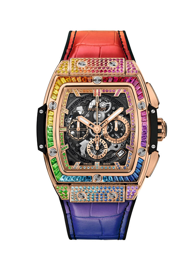 Spirit of Big Bang彩虹宝石手表以光芒万丈的黄金表壳,密镶熠熠生辉的圆形和长方形切割彩色宝石,呈现繽纷彩虹色。 手表的时针紧扣镂空计时机芯,宛如镶嵌珍贵宝石的镶爪;42毫米款式的表壳和表圈满满镶嵌了蓝宝石、红宝石、托帕石、沙弗莱石以及紫水晶,如彩虹光晕般的璀璨耀眼,七色彩虹从表壳延伸至鱷鱼皮表带。 手表搭载具备高震频特徵以及50小时动力储存的自制HUB4700机芯,这枚机芯被收藏家视为迄今为止最佳瑞士计时机芯之一。