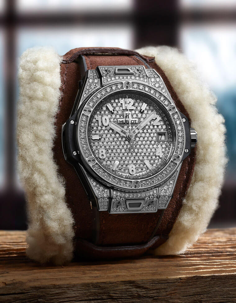 宇舶替Big Bang One Click魔幻绒毛手表打造了四款可替换式绒毛皮革表带,分别为棕色、驼色、蓝色和黑色 ,可和品牌旗下39毫米手表的皮革或橡胶表带搭配。无论是丛林时尚或是都会摩登的 造型风格皆可即刻呈现。而之所以能有如此高的互通性,正是得利于宇舶专利的One Click单键快速式表带装置,佩戴者只需轻 触按把,即可轻松地自己动手为经典的Big Bang 39毫米手表快速更换表带。这种巧妙的原创专利表带系统,可以让手表化身成能搭配出百变造型的时尚单品。