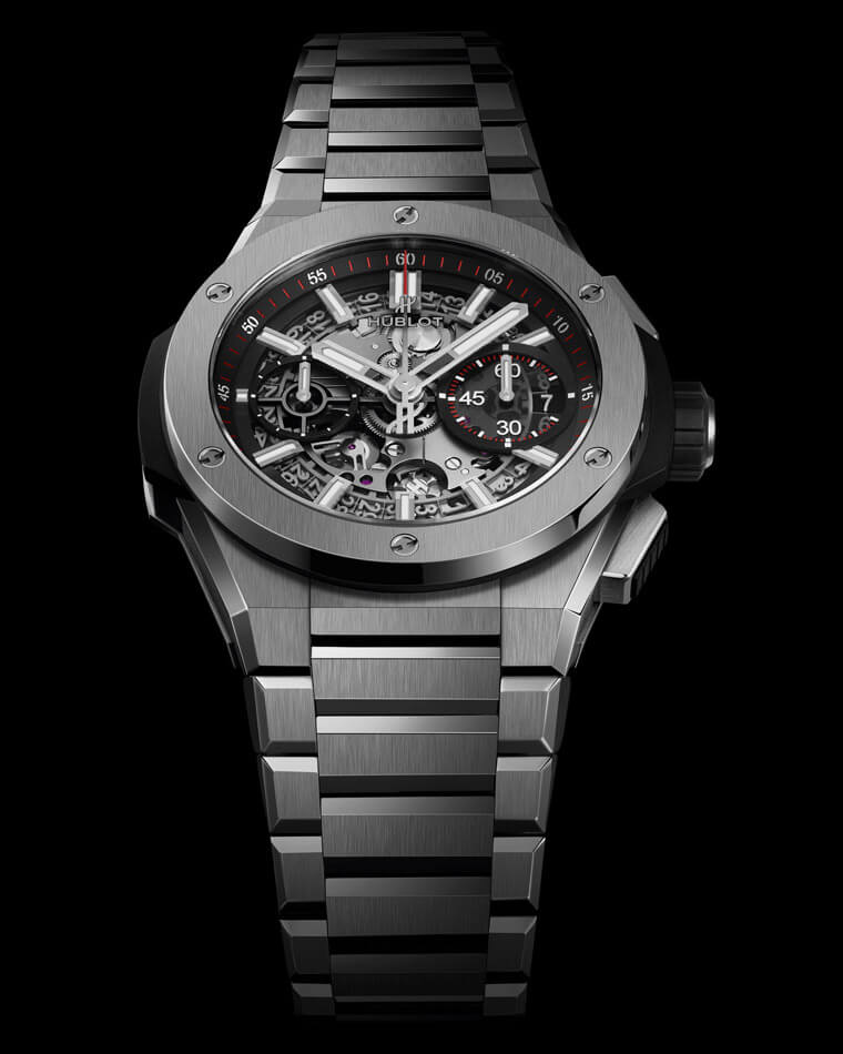 2020年迎接Big Bang系列15周年,首次推出配备品牌具有量身订制的一体式链带手表——Big Bang Integral计时码表,佩戴舒适服贴 ,设计比例巧妙营造和谐的视觉效果。手表的的面盘与表圈与现行Big Bang 42毫米系列具有相同特色,区别在于运用时标取代数字,而计时按把回朔到2005年的Big Bang手表原创设计。全新链带的设计风格,灵感也正来自当年的计时按把,藉由相互交错的棱角与倒角,镜面抛光与缎面处理的交替变化,从表壳的中层到链带,强化这款手表的超凡整体风格。计时码表承袭经典「三明治」多重结构表壳,但不再使用复合树脂,而是整体表壳全部由单一材质所制作。